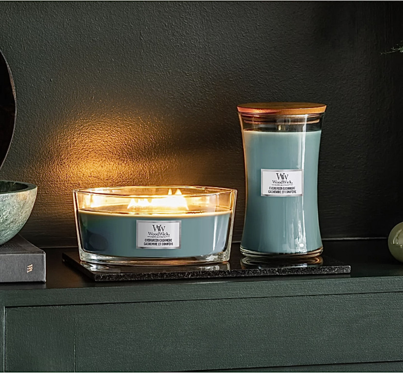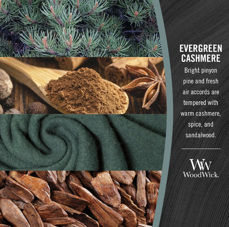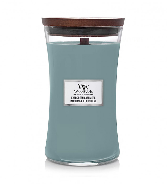 - Evergreen Cashmere - L WoodWick mirisna sveća (borove iglice, balsam, sandalovina, kašmir...)